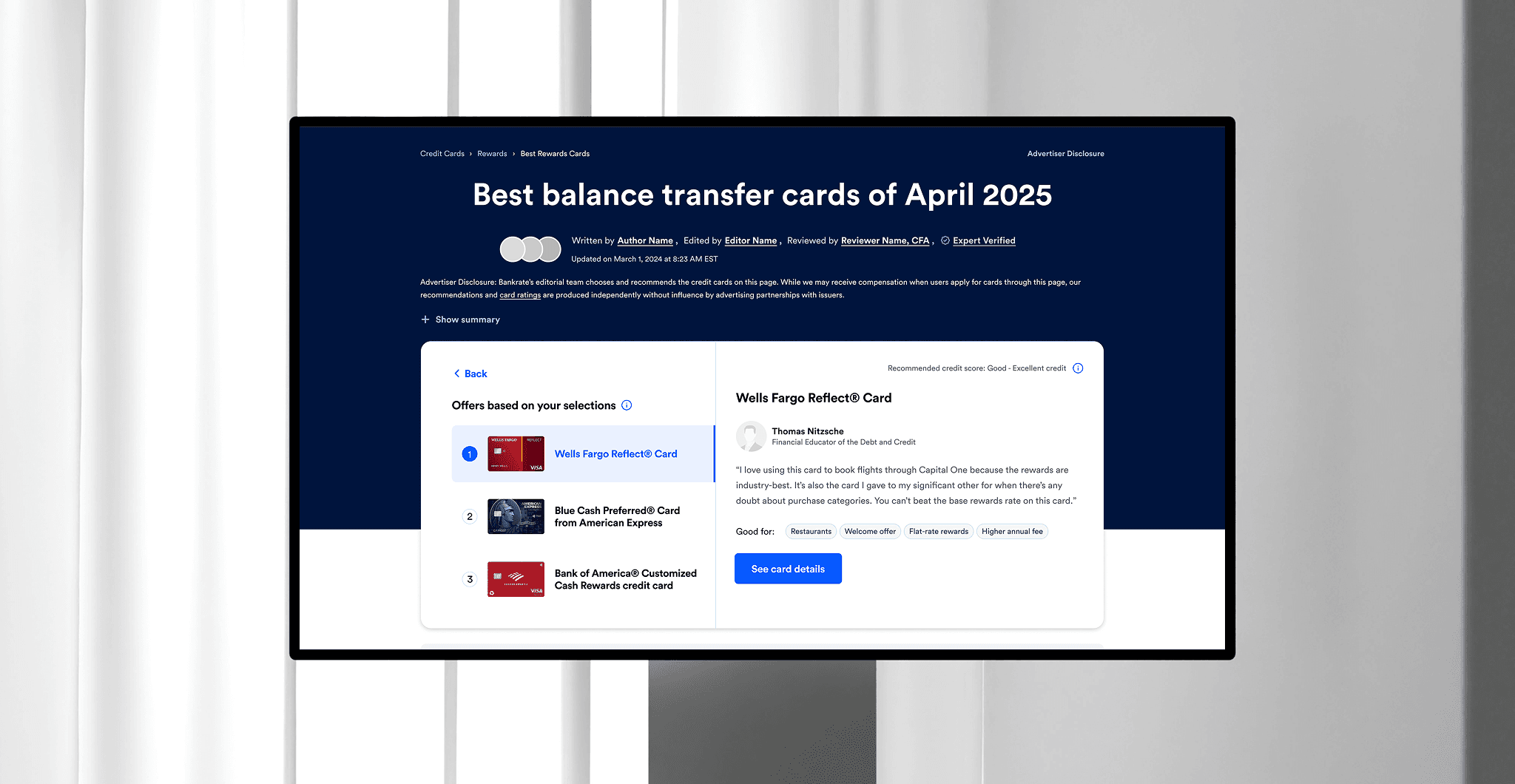 Improved Bankrate’s credit card page experience through clearer structure and new components, increasing engagement and lifting click-through rates by 20%.